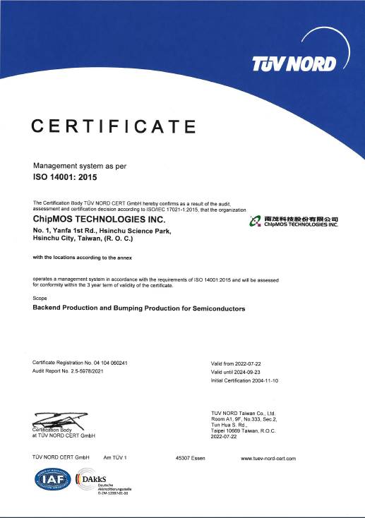 ISO 14001 Certified - ChipMOS Shanghai
